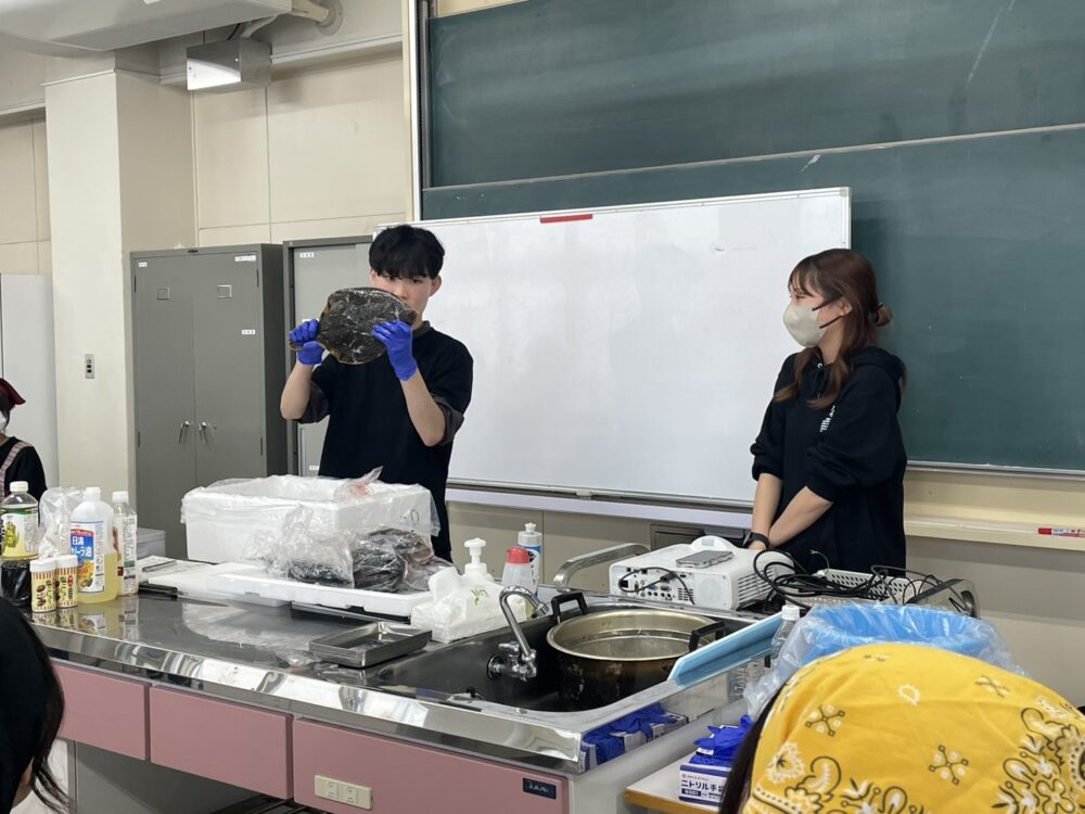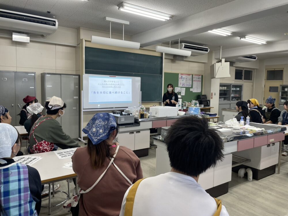 魚をメインにした授業で現在の北海道・世界の魚介類の消費量や漁師さんの高齢化、魚の栄養素について学びました。2048年に海から魚がいなくなる「2048年問題」にも触れ、海が抱える課題について考える貴重な時間となりました。
