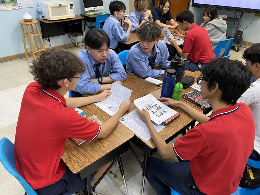 この留学に向けて、英会話レッスンやコミュニケーションの概念学習などの事前研修に取り組みました。現在は、姉妹校であるグアムのセント・ジョーンズスクールにて、現地の生徒と一緒に英語で授業を受けています。
