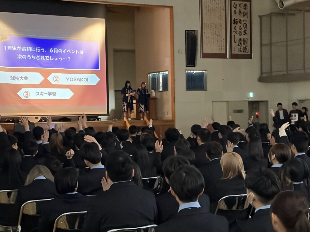 2〜3年生が見守るなか体育館に集まった241名の新入生。はじめは緊張した面持ちでしたが、1学年の担任の先生方のランウェイを歩いていくような紹介や、クイズ形式での行事紹介、実演、動画、スライドでの部活動紹介と、会が進むにつれて和んでいきました。